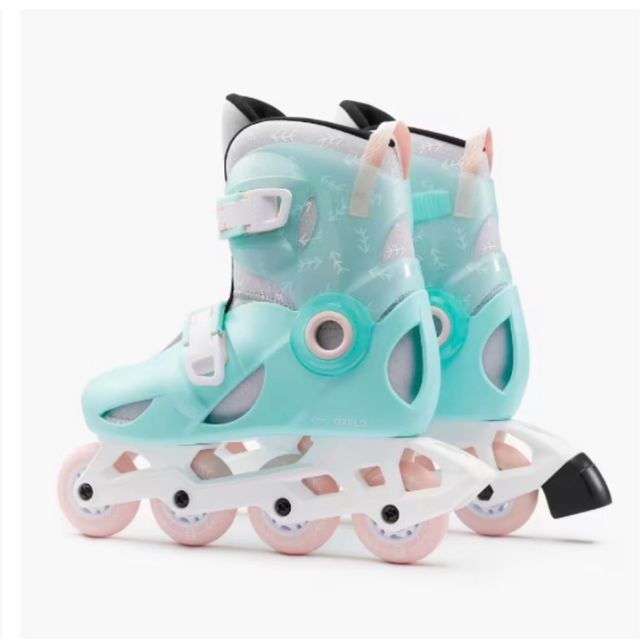 Detalles del productoPatines en línea para niña de Decathlon, en color azul turquesa con detalles blancos y rosas.