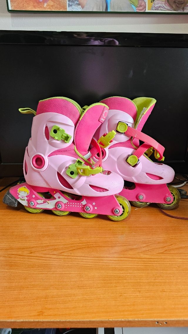 Patines en línea infantiles, ideales para principiantes. Son de color rosa y verde, y lucen en muy buen estado.