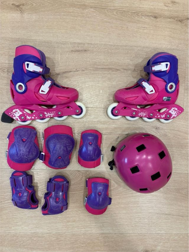 Detalles del productoConjunto de patines en línea para niña, talla 30-32, con protecciones y casco.