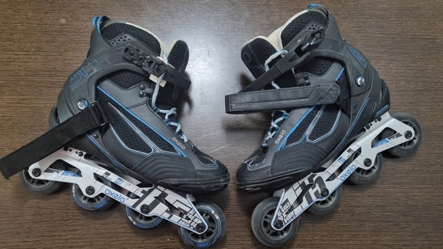 Detalles del productoSe venden patines en línea Oxelo en color negro y azul, ideales para iniciarse en el patinaje.
