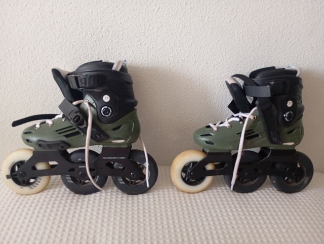 Se venden patines Oxelo de tres ruedas en talla 37. Están en buen estado. - Color verde y negro. - Cierre con cordones y hebillas.