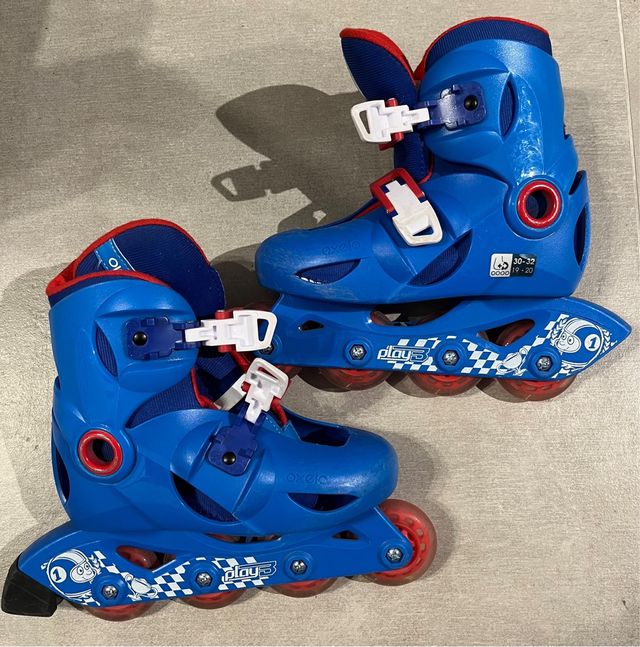 Patines en línea de color azul y rojo, marca Oxelo, talla 30-32. Perfectos para iniciarse en el patinaje. - Cierre con velcro y hebilla. - Freno trasero.