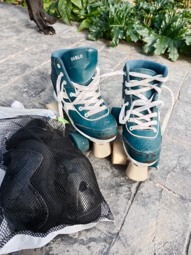 Patines de cuatro ruedas marca Oxelo en color azul verdoso y blanco. Talla 35.