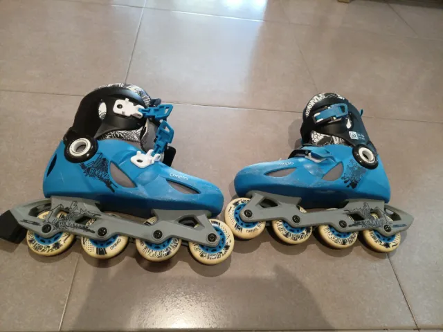 Detalles del productoSe venden patines en línea de color azul, marca Oxelo. Son ideales para iniciarse en el patinaje.