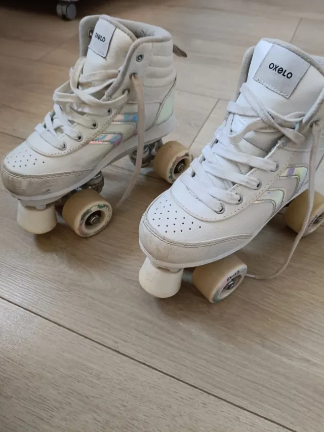 Se venden patines Oxelo blancos, ideales para iniciarse en el patinaje. - Diseño de bota alta para mayor sujeción. - Cierre con cordones. - Ruedas de poliuretano.