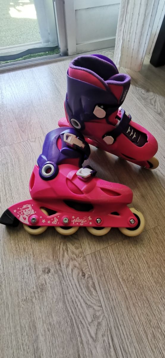 Patines en línea de color rosa y morado, ideales para iniciarse en el patinaje. Talla ajustable para adaptarse al crecimiento. 32/33/34