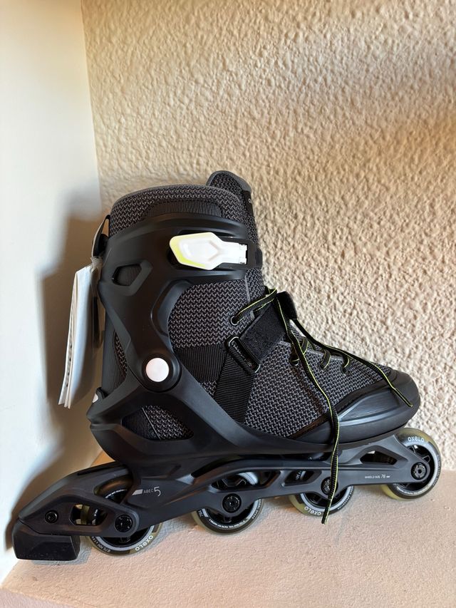 Patines en línea Oxelo Fit 100 en color negro con detalles en amarillo. - Ruedas de 76 mm. - Talla 46 - Sistema de ajuste ABEC 5.