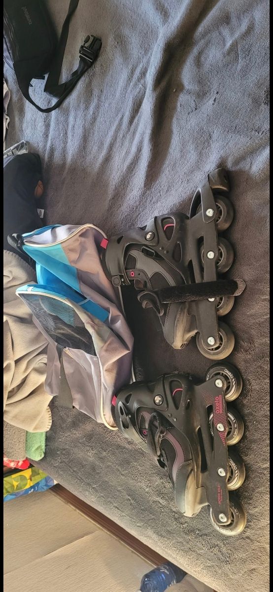 Detalles del productoPatines Oxelo Fitness usados, en buen estado. Ideales para principiantes o uso ocasional. Se incluyen dos patines y una bolsa de transporte. - Diseño cómodo y ligero. - Ruedas en buen estado. - Color negro con detalles en rosa.