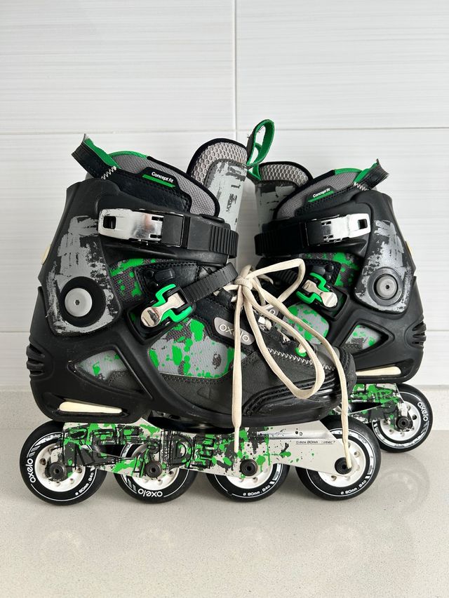 Patines en línea Oxelo Freeride 5 con un diseño llamativo en negro y verde.