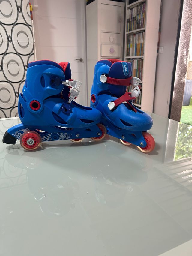 Patines Oxelo para niños, en color azul. Están en buen estado y son ideales para principiantes. - Color azul y rojo. - Ajustables. - Con ruedas de goma.