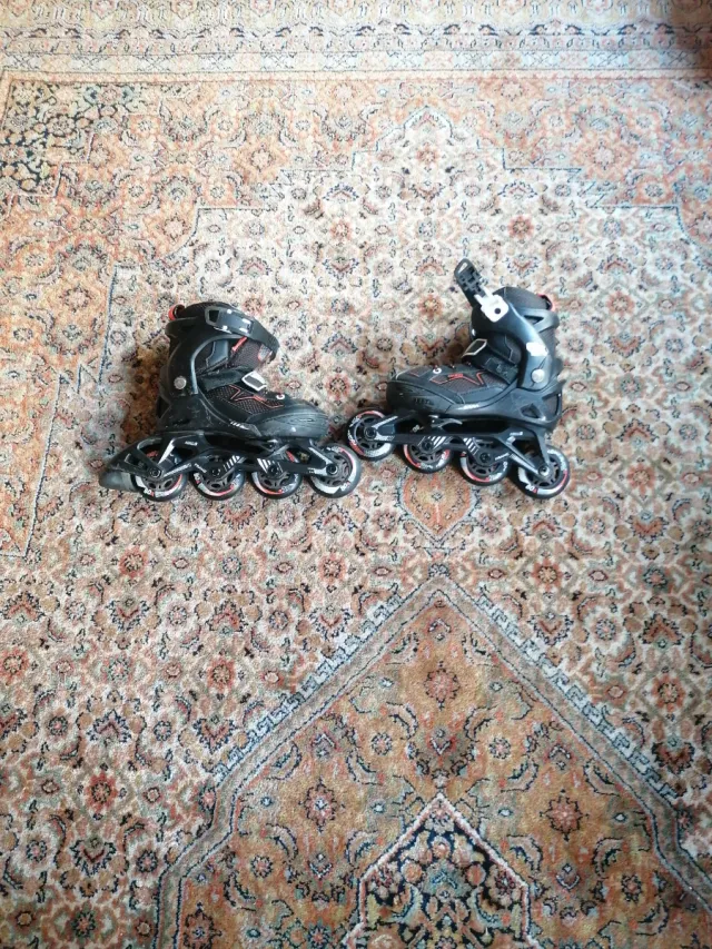 Patines en línea Oxelo de color negro. - Cierre de velcro y hebilla. - Ruedas de poliuretano. - Talla ajustable 29 - 32