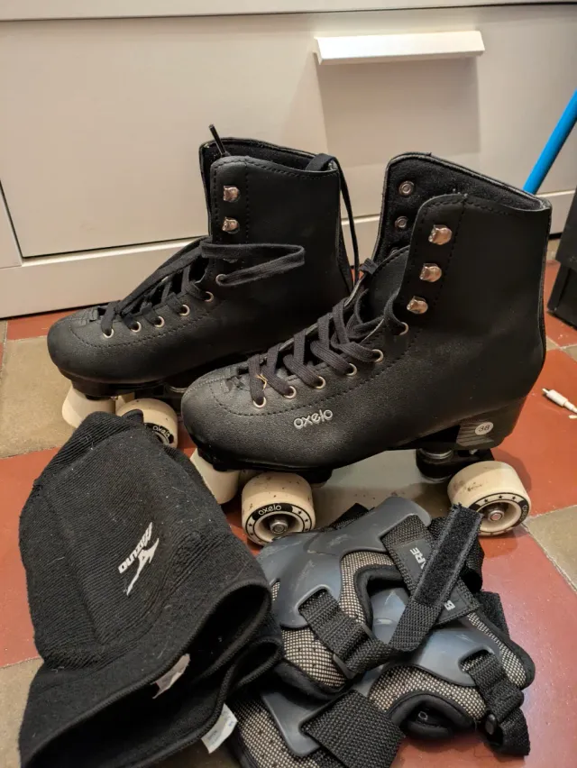 Detalles del productoSe venden patines en línea negros Oxelo, talla 38, junto con un juego de protecciones.