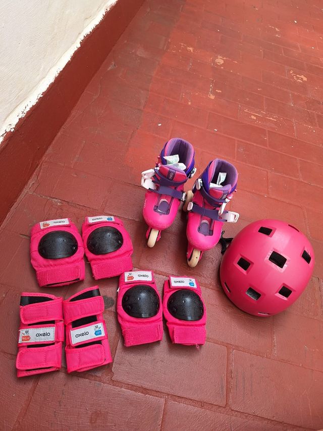 Detalles del productoPatines Oxelo para niña, en buen estado. Incluye casco y juego de protecciones (rodilleras y coderas). Son de color rosa y morado.