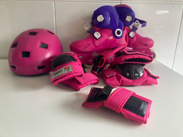 Detalles del productoPatines rosas, talla 32-34, en buen estado. Incluye casco y juego de protecciones (rodilleras, coderas y muñequeras) a juego. Ideales para principiantes.