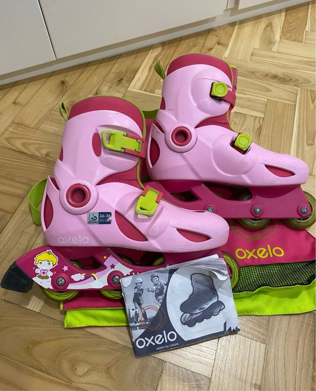Detalles del productoPatines en línea Oxelo para niños, color rosa, ideales para iniciarse en el patinaje.