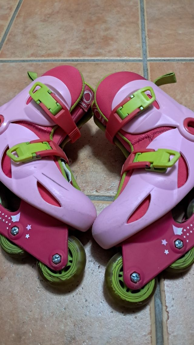 Detalles del productoPatines infantiles en buen estado, ideales para niñas. Son de color rosa y verde, con detalles de estrellas.
