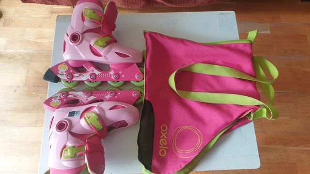 Detalles del productoSet de patines infantiles de la marca Oxelo en color rosa. Funda de regalo.
