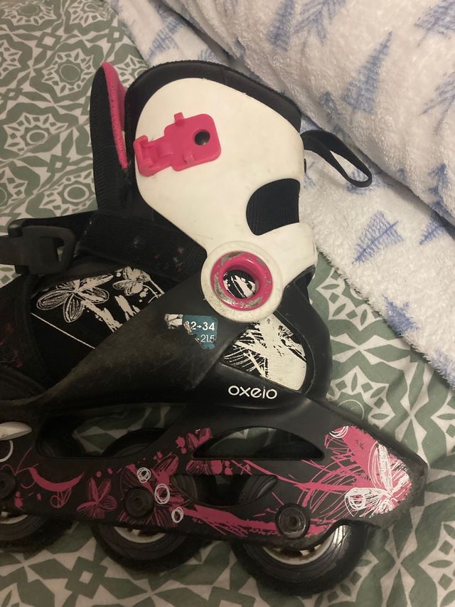 Detalles del productoPatines en línea Oxelo para niña, talla 32-34 (21.5 cm). Diseño con mariposas y detalles en rosa.