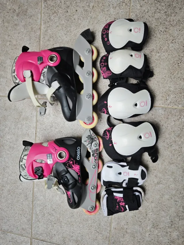 Detalles del productoSet de patines Oxelo para niña en talla 32-34, con un diseño en color negro y rosa. Incluye protecciones.