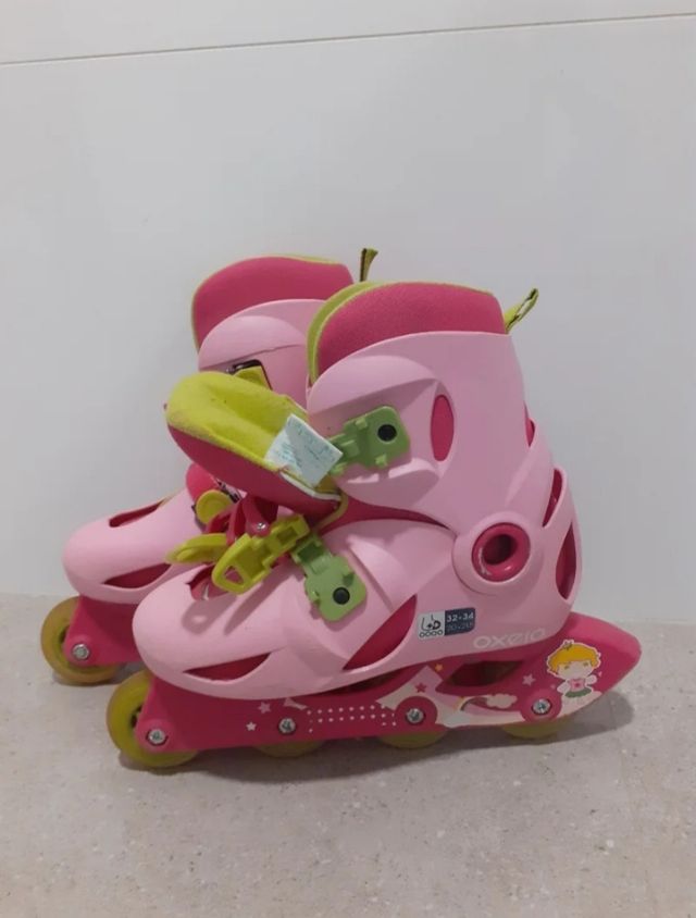 Patines en línea de color rosa para niña, talla 32-34. - Diseño con detalles en verde lima y rosa. - Cierre de velcro y hebilla. - Ruedas de color amarillo.