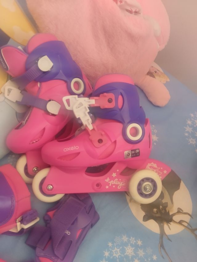 Detalles del productoPatines en línea infantiles Oxelo Play, en color rosa y morado. Ideales para que los más pequeños empiecen a patinar.