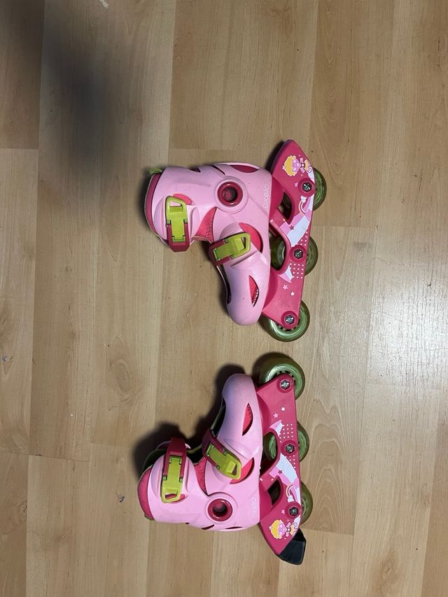 Detalles del productoPatines Oxelo Play 3 de Decathlon, ideales para principiantes. Están en buen estado y son de color rosa y verde lima.