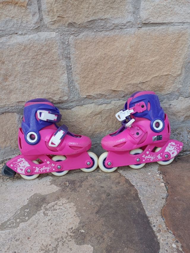 Detalles del productoPatines Oxelo Play 3 en color rosa y morado, ideales para niñas. Están en buen estado y listos para usar.