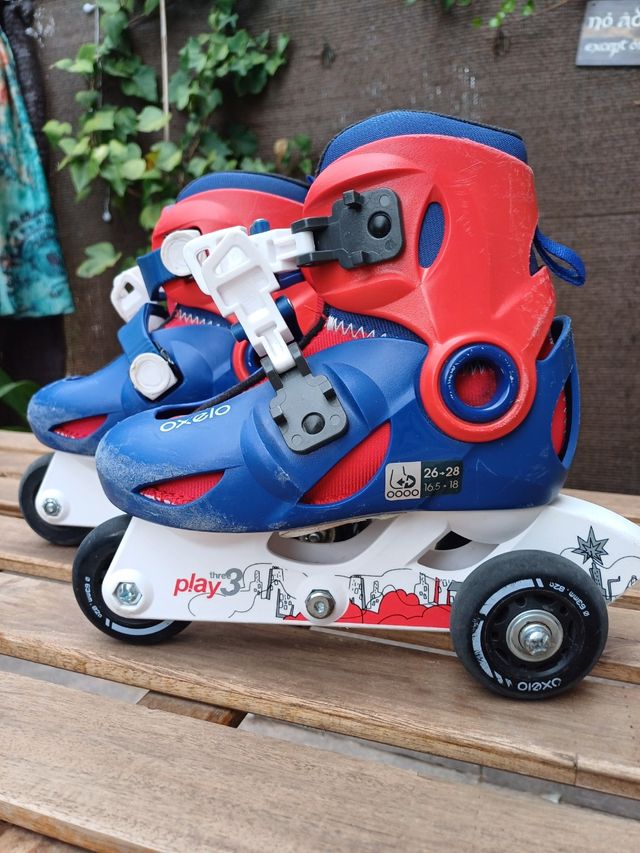 Patines de iniciacion para que tu hijo se inicie con los rollers controlando la velocidad. Se pueden poner las ruedas en linea o en firma de triciclo, 1 delante, 2 detras, como se ve en la foto.