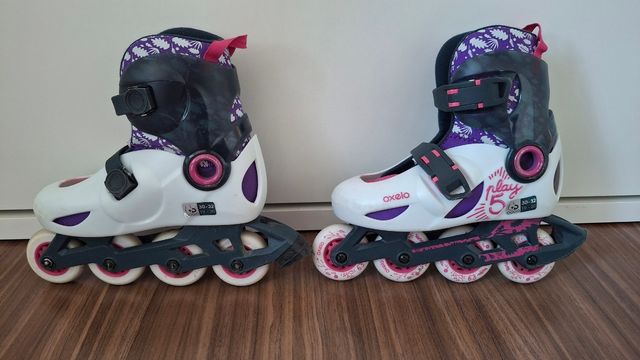 Patines en línea Oxelo Play 5. - Diseño blanco con detalles morados y rosas. - Talla ajustable de 30 a 32. - Ruedas de 63 mm.