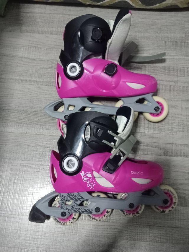 Detalles del productoSe venden patines en línea de color rosa, marca Oxelo. Son ajustables para adaptarse a diferentes tallas.