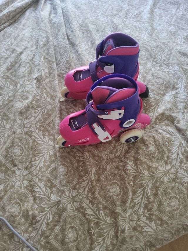 Detalles del productoSe venden patines infantiles de la marca Oxelo en color rosa y morado. Son ajustables para adaptarse al crecimiento del pie.