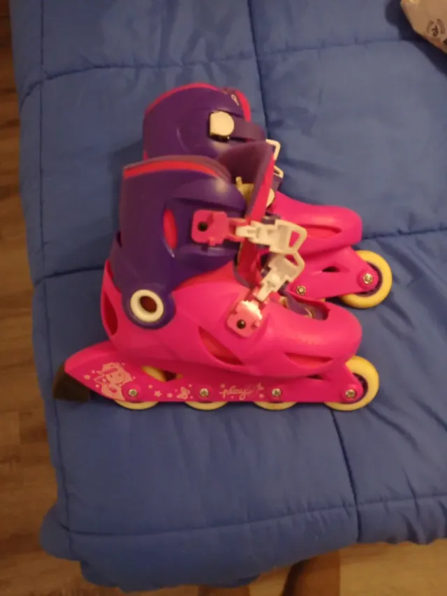 Patines en línea Oxelo en color rosa y morado. - Diseño infantil. - Ruedas amarillas. - Cierre de velcro y hebilla.