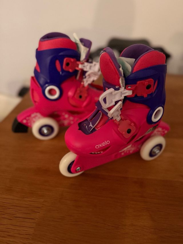 Detalles del productoPatines en línea Oxelo en color rosa y morado, ideales para niñas. Son ajustables para adaptarse al crecimiento.