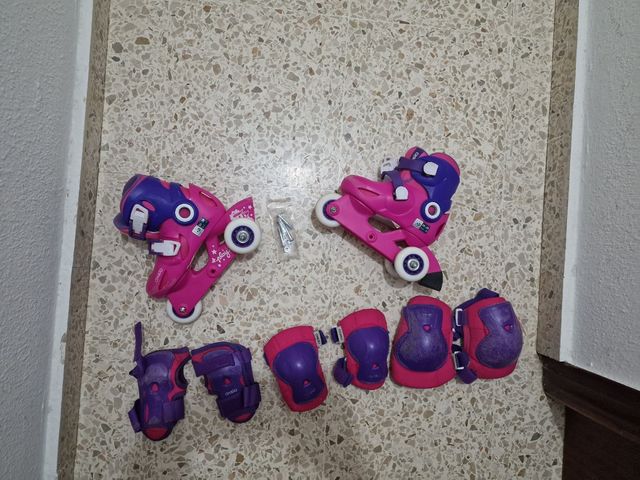 Los patines sólo se usaron dos veces. No le gusta patinar. Regalo protecciones de la hermana un poco usadas pero se pueden seguir usando perfectamente. También regalo tornillos para poner todas las ruedas en línea cuando haya aprendido.