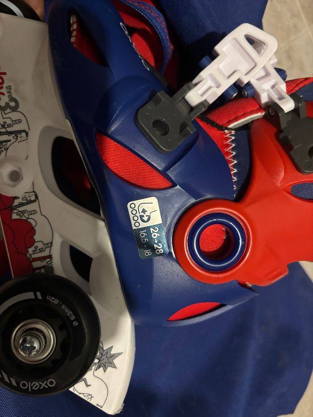 Patines infantiles de la marca Oxelo, talla 26-28. - Color azul y rojo. - Cierre de hebilla. - Ruedas de 63mm.