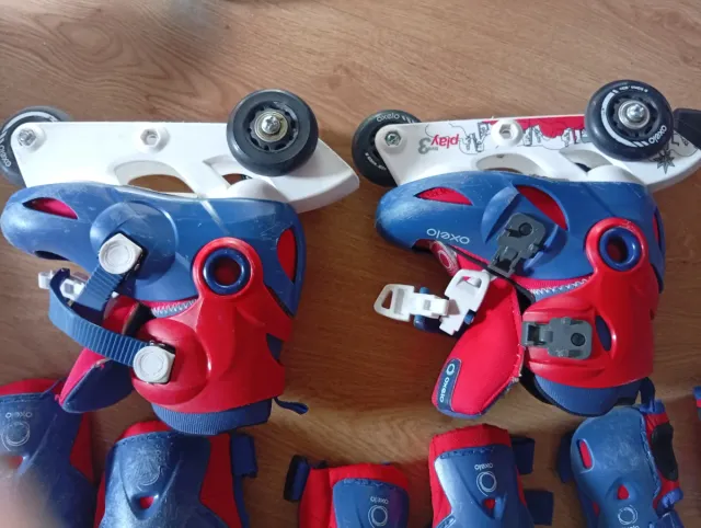Set de patines en línea Oxelo para niños, talla ajustable de la 26 a la 28. Incluye protecciones. - Color azul y rojo. - Cierre con velcro y hebilla. - Ruedas de patinaje.