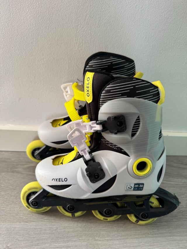Patines en línea Oxelo para niñas/os, talla 28-30. Muy poco uso, en buen estado. - Diseño en blanco y amarillo. - Cierre de velcro y hebilla. - Ruedas amarillas.