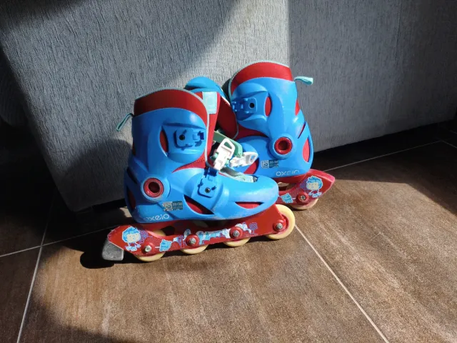 Patines en línea Oxelo en color azul y rojo, talla 32-34. Las ruedas han sido cambiadas. - Diseño infantil. - Cierre de hebilla y tensor.