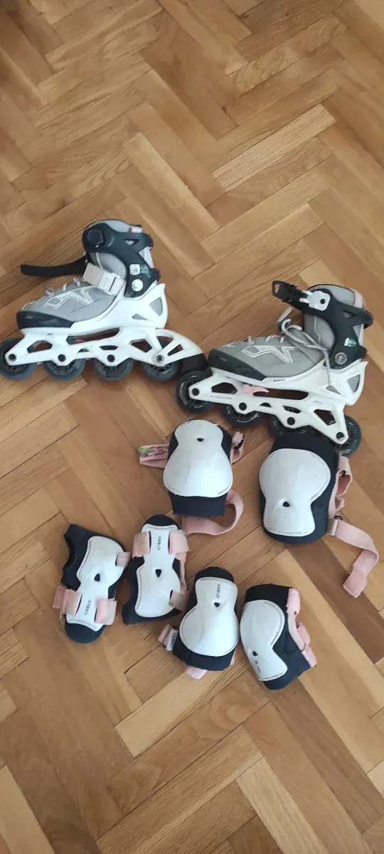 Detalles del productoSet de patines en línea Oxelo ajustables en talla de la 32 a la 35, ideales para iniciarse en el patinaje. Incluye protecciones para mayor seguridad.