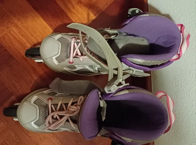 Patines en línea Oxelo, ideales para iniciarse en el patinaje. - Color gris con detalles en morado y rosa. - Cierre de velcro y cordones. - Ruedas de 70mm.