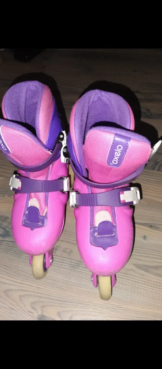 Patines en línea de la marca Oxelo en talla 32. - Color rosa y morado. - Cierre con velcro y hebilla.