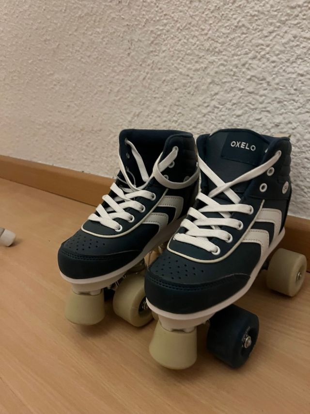 Patines de cuatro ruedas de la marca Oxelo (Decathlon) en color azul marino y blanco. Talla 34. - Diseño de caña alta. - Cierre con cordones blancos. - Freno intacto