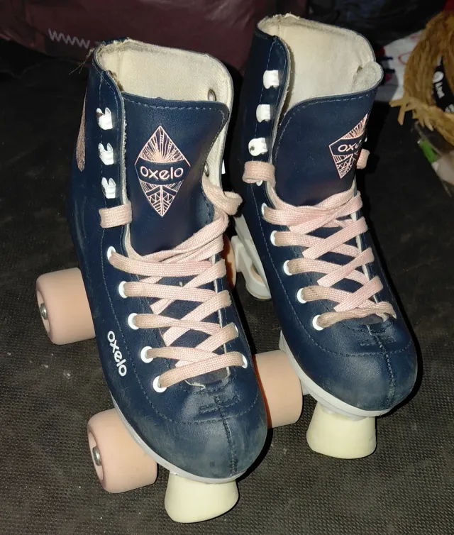 Patines de la marca Oxelo en color azul marino con cordones rosas. Decathlon - Talla 34-35. - Diseño de caña alta. Usados 2 meses
