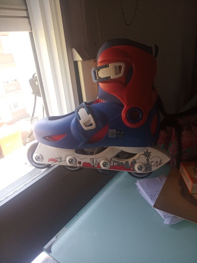Patines en línea Oxelo para niños, talla 34-36. Perfectos para iniciarse en el patinaje. - Diseño en color azul y rojo. - Cierre de velcro y hebilla. - Ruedas de 70mm.
