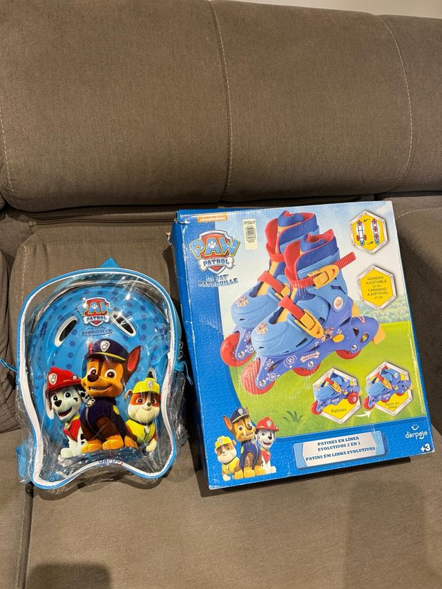 Detalles del productoSet de patines y casco de Paw Patrol para niños. El casco es azul con dibujos de los personajes de la Patrulla Canina.