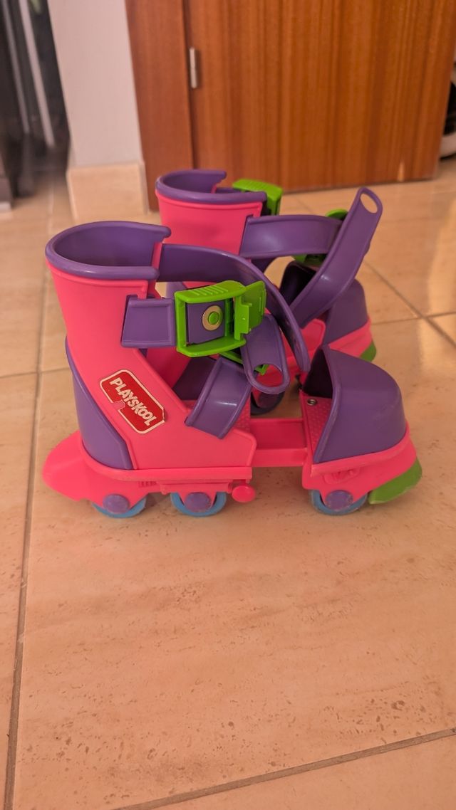 Detalles del productoPatines de aprendizaje PlaySkkool, ideales para principiantes. Son de color rosa y morado, y se encuentran en buen estado.