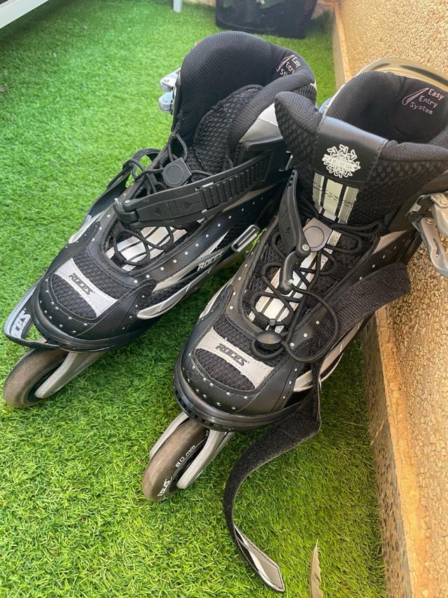 Detalles del productoPatines en línea Roces, ideales para principiantes. Son de color negro y plateado, y se encuentran en buen estado.