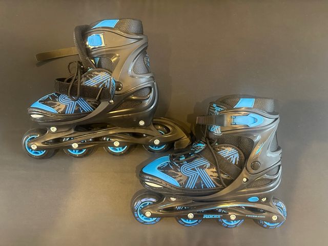 Patines en línea Roces Junior Joker 3. - Talla ajustable de 38 a 41. - Diseño en color negro y azul. - Cierre de velcro y hebilla. Solo se han usado una vez.