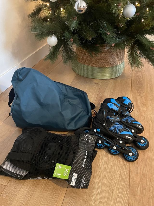 Detalles del productoSet de patines Roces para niño, con medida adaptable a tallas 26-29, en color azul y negro. Incluye bolsa de transporte y protecciones Oxelo talla xs.