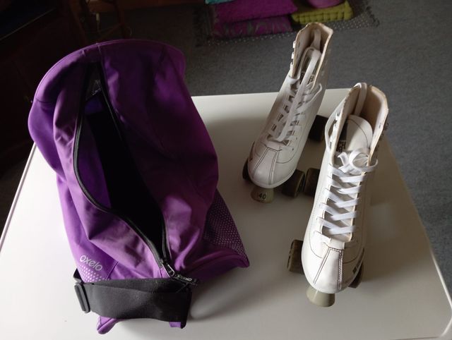 Detalles del productoSe venden patines de bota de la marca Roller School , en color blanco. Incluyen una bolsa de transporte de color morado. Marca Oxelo